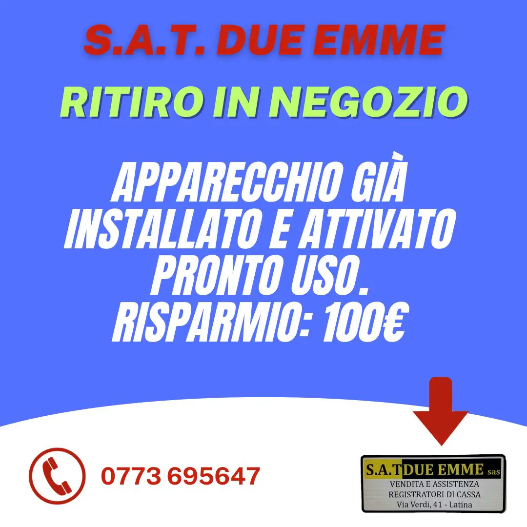 S.A.T. DUE EMME è il partner ideale per l'automazione del punto cassa della Vostra attività commerciale. Dal 1989, ci siamo specializzati nell'offrire servizi completi e professionali nel campo dei Registratori di Cassa Telematici, Stampanti Fiscali Telematiche, Pos System Touch Screen, Software Gestionale Applicativo, Stampanti Ricevute Termiche e Comande, Rotoli Termici Omologati, Terminali Portatili, Scanner Barcode, Rilevatori Verifica Banconote False, Elimina Code, APP ORDINI LOCALI, VIDEOSORVEGLIANZA e Conta Banconote. Il nostro obiettivo è garantire la massima efficienza al miglior prezzo sul mercato.